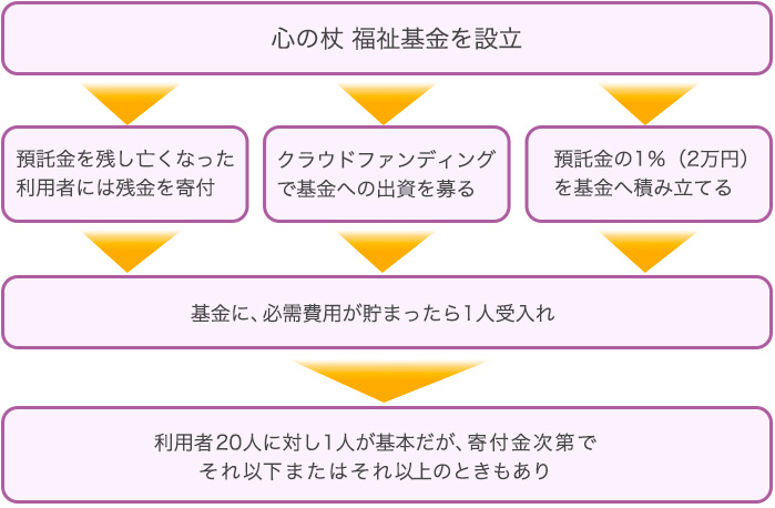 「心の杖」福祉基金は、預託金の残金寄付やクラウドファンディング資金、財産の一部寄付などで資金を積み立てます。これらの資金を使って、生活困窮者の身元保証や生活支援を行います。なかでも生活保護にはならない生活困窮者の方は、行政のバックアップが受けられずお困りの場合がありますので、この福祉基金で救済させていただきます。
